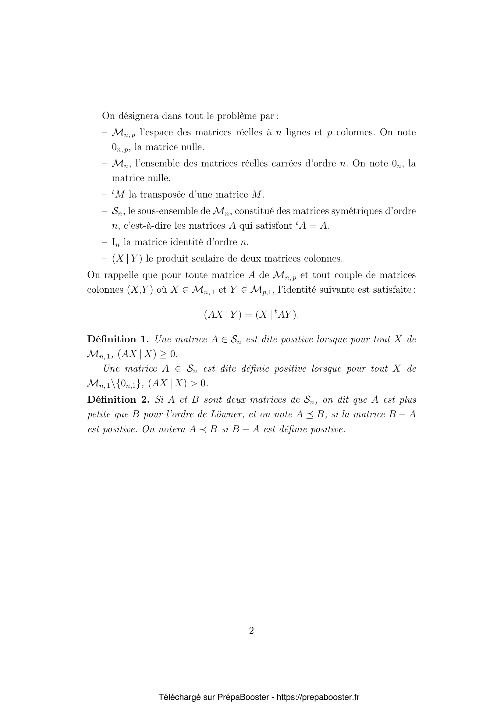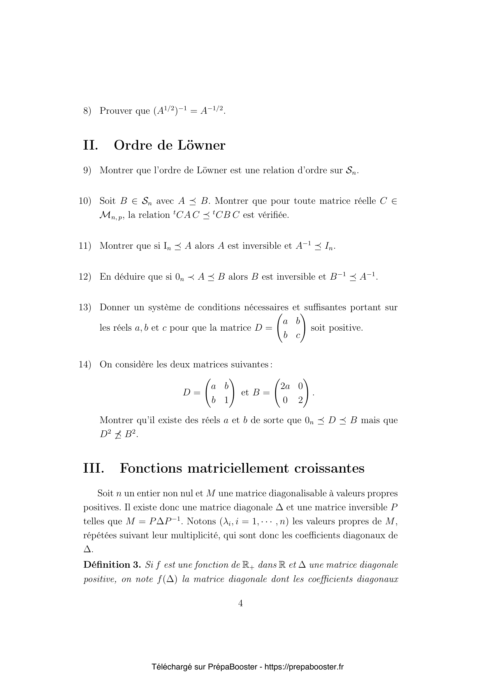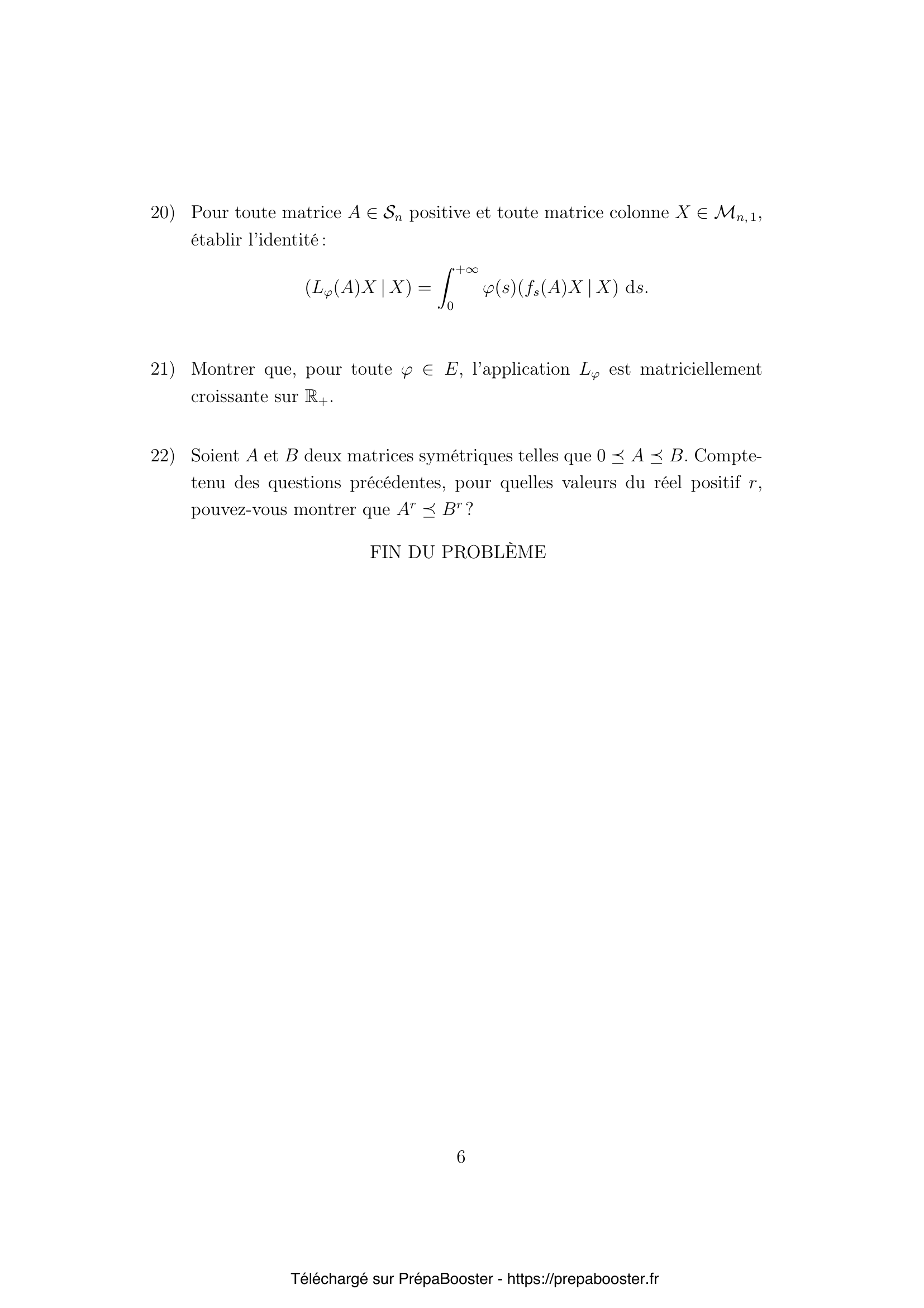 1. Montrer que si $A$ est positive, alors pour toute matrice réelle $M \in \mathcal{M}_{n,p}$, la matrice $M^t A M$ est symétrique positive. 2. Montrer que toutes les puissances entières d’une matrice symétrique positive $A$ sont positives. 3. Montrer que $A \in \mathcal{S}_n$ est positive, respectivement définie positive, si et seulement si les valeurs propres de $A$ sont toutes positives, respectivement strictement positives. 4. Si $A$ est définie positive, montrer qu’il existe une matrice $C$, symétrique définie positive telle que $C^2 = A$. 5. Si $A$ et $C$ sont symétriques définies positives et $C^2 = A$, montrer que, pour toute valeur propre $\lambda$ de $A$, on a~:\\ $\ker(A-\lambda I_n) = \ker(C-\sqrt{\lambda} I_n)$.} 6. En déduire que si $A$ est définie positive, il existe une unique matrice symétrique définie positive $C$ telle que $C^2 = A$ et que dans toute base orthonormale de vecteurs propres de $A$, la matrice $C$ est diagonale.\\ On notera désormais $C = A^{1/2}$. 7. On suppose $A$ définie positive. Montrer que $A$ est inversible et qu’il existe une unique matrice, notée $A^{-1/2}$, symétrique définie positive telle que $A^{-1/2}A^{-1/2} = A^{-1}$. 8. Prouver que $(A^{1/2})^{-1} = A^{-1/2}$. 9. Montrer que l’ordre de Löwner est une relation d’ordre sur $\mathcal{S}_n$. 10. Soit $B \in \mathcal{S}_n$ avec $A \preceq B$. Montrer que pour toute matrice réelle $C \in \mathcal{M}_{n,p}$, la relation $C^t A C \preceq C^t B C$ est vérifiée.} 11. Montrer que si $I_n \preceq A$ alors $A$ est inversible et $A^{-1} \preceq I_n$. 12. En déduire que si $0_n \prec A \preceq B$ alors $B$ est inversible et $B^{-1} \preceq A^{-1}$. 13. Donner un système de conditions nécessaires et suffisantes portant sur les réels $a$, $b$ et $c$ pour que la matrice $D = \begin{pmatrix} a & b \\ b & c \end{pmatrix}$ soit positive. 14. On considère les deux matrices suivantes~:\\ $D = \begin{pmatrix} a & b \\ b & 1 \end{pmatrix}$\\ et $B = \begin{pmatrix} 2a & 0 \\ 0 & 2 \end{pmatrix}$.\\ Montrer qu’il existe des réels $a$ et $b$ de sorte que $0_n \preceq D \preceq B$ mais que $D^2 \npreceq B^2$. 15. On considère $f$ une fonction de $\mathbb{R}^+$ dans $\mathbb{R}$ et l’on note $R = P f(\Delta) P^{-1}$.\\ Soit $X \in \mathcal{M}_{n,1}$ et $\lambda$ un réel positif tels que $M X = \lambda X$. Calculer $R X$.} 16. Montrer que, pour toutes matrices $P$ et $Q$ inversibles et toutes matrices diagonales $\Delta_P$ et $\Delta_Q$ de $\mathcal{M}_n$ telles que $M = P \Delta_P P^{-1} = Q \Delta_Q Q^{-1}$, on a~:\\ $P f(\Delta_P) P^{-1} = Q f(\Delta_Q) Q^{-1}$. 17. Pour $r \in \mathbb{R}$, on pose $\varphi_r(s) = s^{-r-1}$. Pour quelles valeurs de $r$ a-t-on $\varphi_r \in E$~? Exprimer alors, pour tout $t > 0$, $L_{\varphi_r}(t)$ en fonction de $L_{\varphi_r}(1)$. 18. Soit $s \geq 0$. On pose pour tout $t \geq 0$, $f_s(t) = 1 – \frac{1}{1+st}$. Exprimer $f_s(A)$ lorsque $A$ est une matrice symétrique positive. 19. Montrer que $f_s$ est matriciellement croissante sur $\mathbb{R}^+$. 20. Pour toute matrice $A \in \mathcal{S}_n$ positive et toute matrice colonne $X \in \mathcal{M}_{n,1}$, établir l’identité~: \\ $(L_\varphi(A)X | X) = \int_{0}^{+\infty} \varphi(s)(f_s(A) X | X) \;ds$.} 21. Montrer que, pour toute $\varphi \in E$, l’application $L_\varphi$ est matriciellement croissante sur $\mathbb{R}^+$. 22. Soient $A$ et $B$ deux matrices symétriques telles que $0 \preceq A \preceq B$. Compte tenu des questions précédentes, pour quelles valeurs du réel positif $r$, pouvez-vous montrer que $A^r \preceq B^r$~?}FAQ