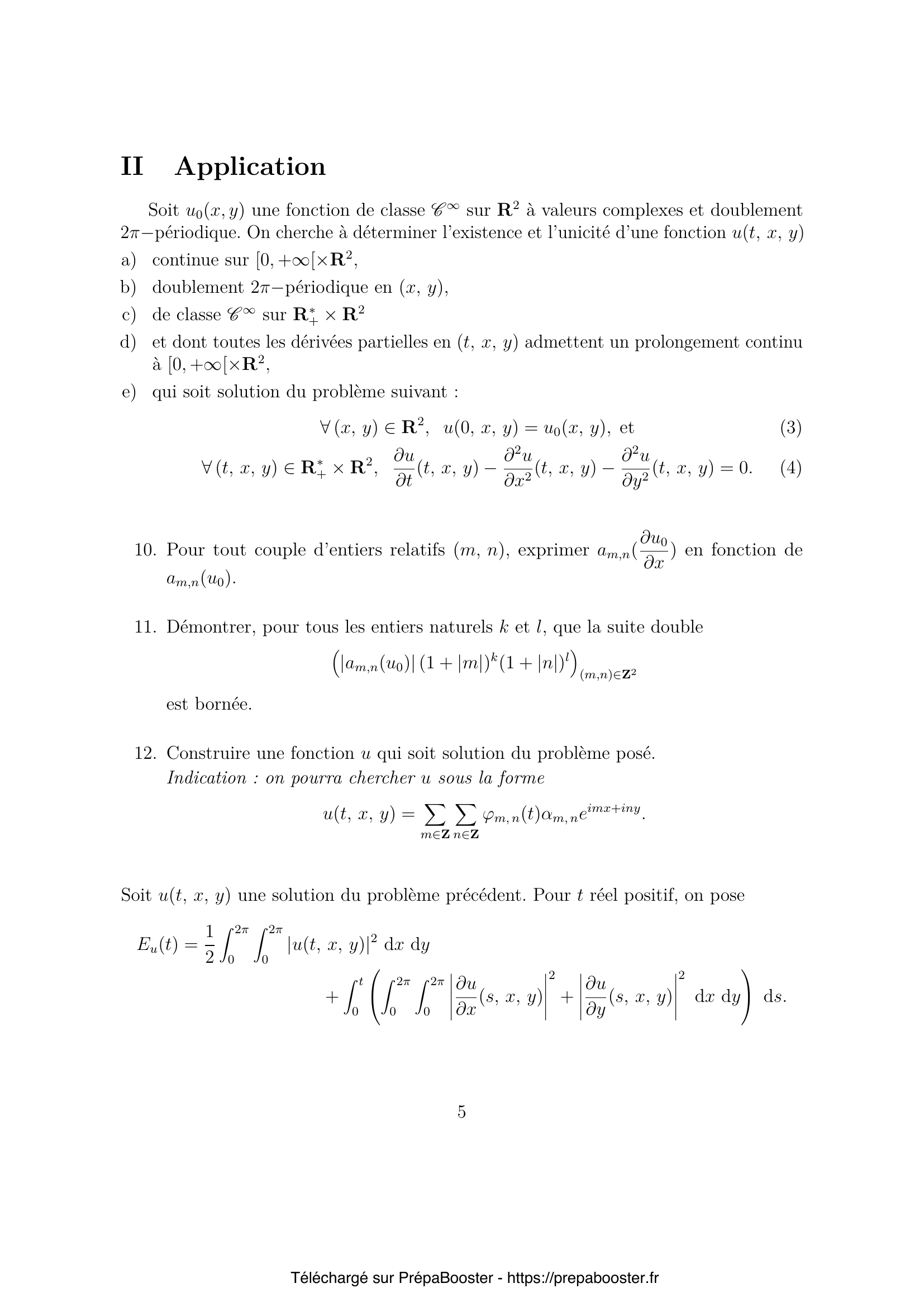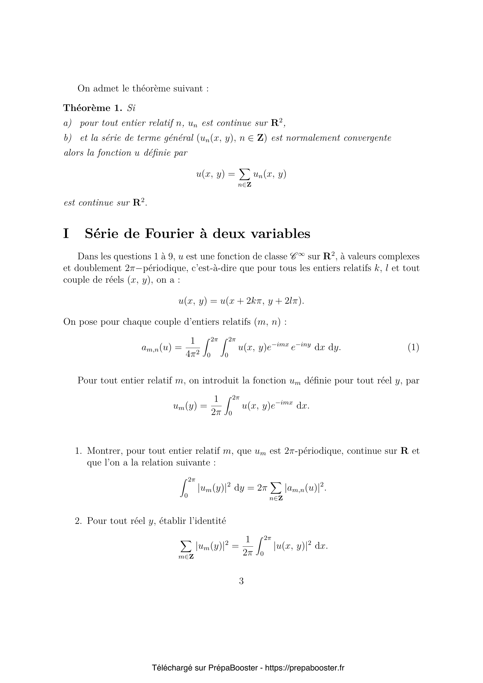 1. Montrer, pour tout entier relatif $m$, que $u_m$ est $2\pi$-périodique, continue sur $\mathbb{R}$ et que l’on a la relation suivante : \[ \int_0^{2\pi} |u_m(y)|^2 \, dy = 2\pi \sum_{n\in\mathbb{Z}} |a_{m,n}(u)|^2. \] } 2. Pour tout réel $y$, établir l’identité \[ \sum_{m\in\mathbb{Z}} |u_m(y)|^2 = \frac{1}{2\pi} \int_0^{2\pi} |u(x, y)|^2 \, dx. \] } 3. Prouver que la série double \[ \sum_{m\in\mathbb{Z}} \sum_{n\in\mathbb{Z}} |a_{m,n}(u)|^2 \] converge et établir l’identité \[ \sum_{m\in\mathbb{Z}} \sum_{n\in\mathbb{Z}} |a_{m,n}(u)|^2 = \frac{1}{4\pi^2}\int_{0}^{2\pi} \int_{0}^{2\pi} |u(x, y)|^2 \, dx \, dy. \] } 4. Prouver que pour tout couple de réels $(x, y)$, la série double suivante est sommable : \[ \sum_{m\in\mathbb{Z}} \sum_{n\in\mathbb{Z}} a_{m, n}(u)\, e^{imx+iny}. \] 5. Prouver que $v$ ainsi définie est continue.} 6. Démontrer que $v$ est de classe $\mathcal{C}^\infty$ sur $\mathbb{R}^2$ et que pour tout couple $(k, l)$ d’entiers naturels : \[ \frac{\partial^{k+l}v}{\partial x^k \partial y^l}(x, y) = \sum_{m\in\mathbb{Z}} \sum_{n\in\mathbb{Z}} (im)^k (in)^l a_{m,n}(u) e^{imx+iny}. \] } 7. Soit un réel $y$. Montrer que pour tout entier relatif $k$, \[ \frac{1}{2\pi} \int_0^{2\pi} v(x, y) e^{-ikx} dx = \sum_{n\in\mathbb{Z}} a_{k,n}(u) e^{iny}. \] } 8. Pour tout couple $(k, l)$ d’entiers relatifs, calculer $a_{k, l}(v)$.} 9. En déduire que $u = v$.} 10. Pour tout couple d’entiers relatifs $(m, n)$, exprimer $a_{m,n} \left( \frac{\partial u_0}{\partial x} \right)$ en fonction de $a_{m,n}(u_0)$.} 11. Démontrer, pour tous les entiers naturels $k$ et $l$, que la suite double \[ \Big( |a_{m,n}(u_0)| (1 + |m| )^k (1+|n|)^l \Big)_{(m,n)\in\mathbb{Z}^2} \] est bornée.} 12. Construire une fonction $u$ qui soit solution du problème posé.\\ \textit{Indication : on pourra chercher $u$ sous la forme} \[ u(t, x, y) = \sum_{m\in\mathbb{Z}}\sum_{n\in\mathbb{Z}} \varphi_{m, n}(t)\alpha_{m, n}e^{imx+iny}. \] } 13. Montrer que la fonction $E_u$ est continue sur $\mathbb{R}_+$ et dérivable sur $\mathbb{R}_+^*$. Exprimer sa dérivée sous forme d’une intégrale sur $[0,2\pi]^2$.} 14. Pour tout $(t, x, y)$ appartenant à $\mathbb{R}_+^* \times \mathbb{R}^2$, établir l’identité suivante~: \[ \left( \frac{\partial u}{\partial x} \frac{\partial \bar{u}}{\partial x} + \frac{\partial u}{\partial y} \frac{\partial \bar{u}}{\partial y} + \frac{u}{2} \frac{\partial \bar{u}}{\partial t} + \frac{\bar{u}}{2} \frac{\partial u}{\partial t} \right)(t, x, y) = \frac{1}{2}\left( \frac{\partial}{\partial x} \left( u \frac{\partial \bar{u}}{\partial x} + \bar{u} \frac{\partial u}{\partial x} \right) + \frac{\partial}{\partial y} \left( u \frac{\partial \bar{u}}{\partial y} + \bar{u} \frac{\partial u}{\partial y} \right) \right)(t, x, y). \] } 15. Prouver que $E_u(t) = E_u(0)$ pour tout $t > 0$.} 16. Montrer que le problème posé possède au plus une solution.}FAQ