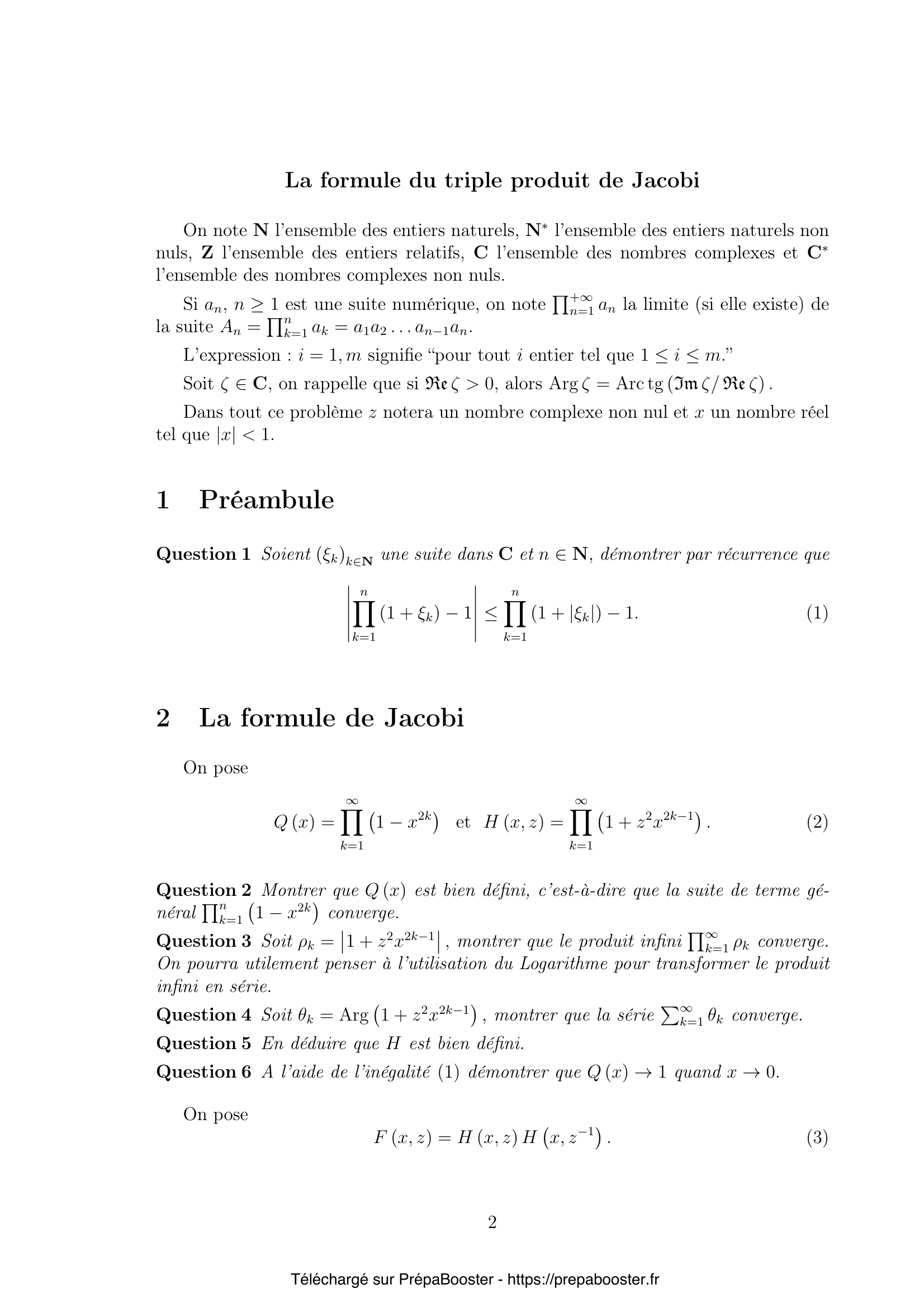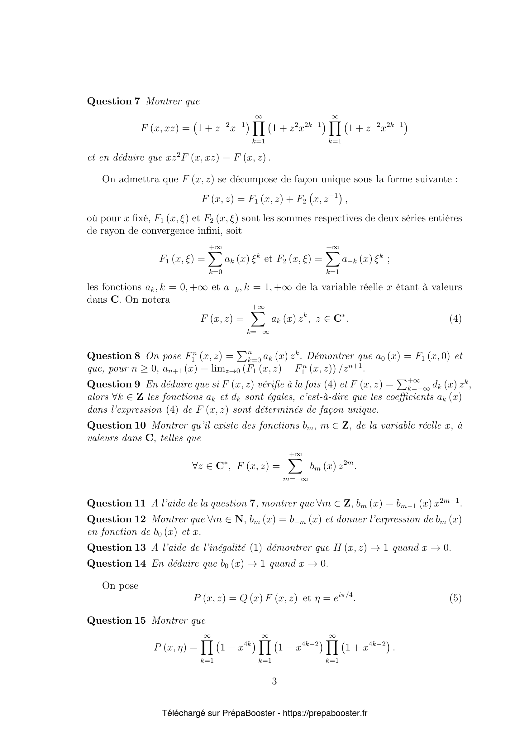 La convergence de ce produit infini est cruciale car elle définit la fonction \(Q(x)\), centrale dans le sujet. Pour la démontrer, tu peux utiliser le critère de convergence des produits infinis : \(\sum_{k=1}^\infty |x^{2k}|\) converge si \(|x| < 1\), car c'est une série géométrique de raison \(|x|^2\). C'est un classique des séries et produits infinis en CPGE !