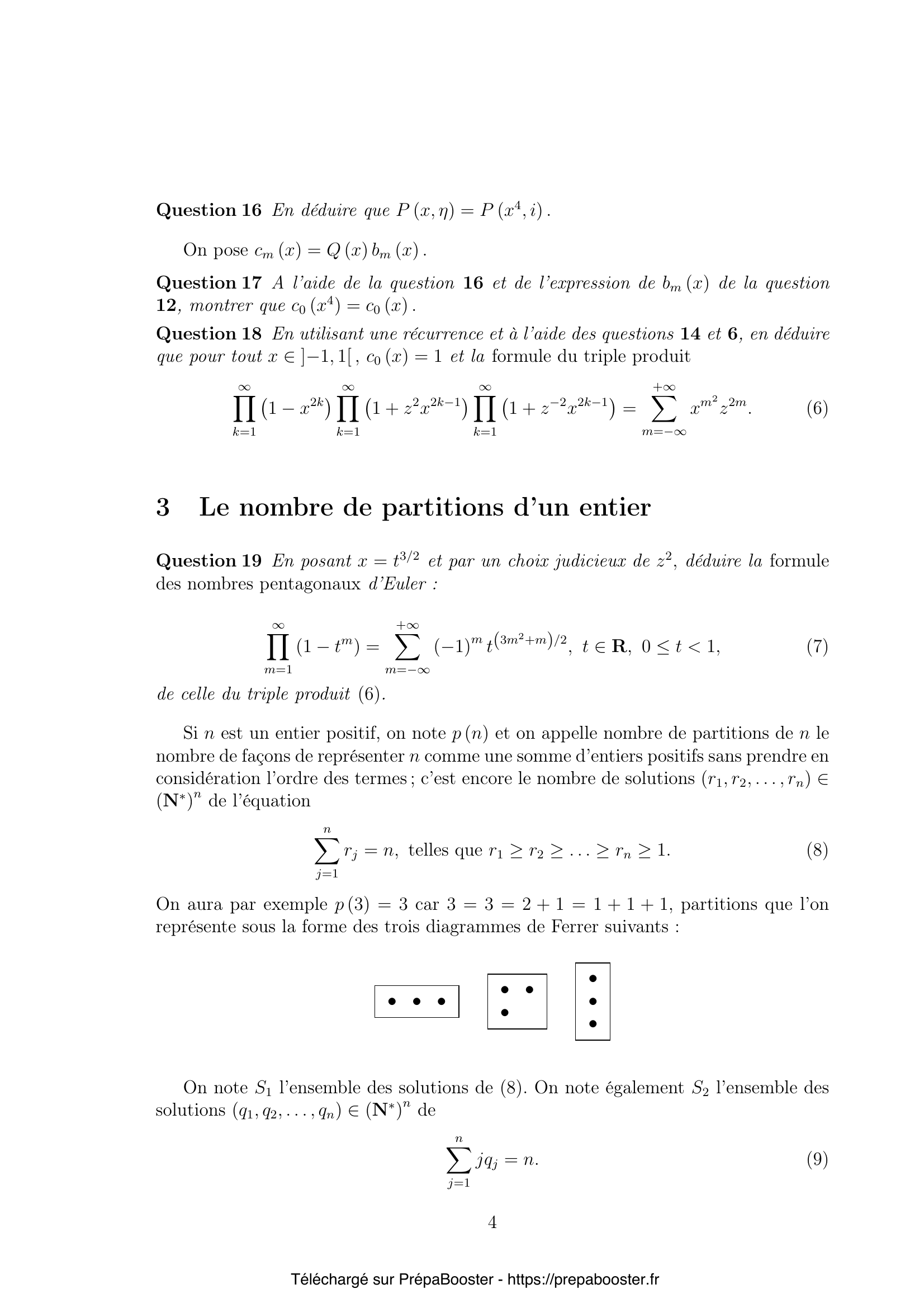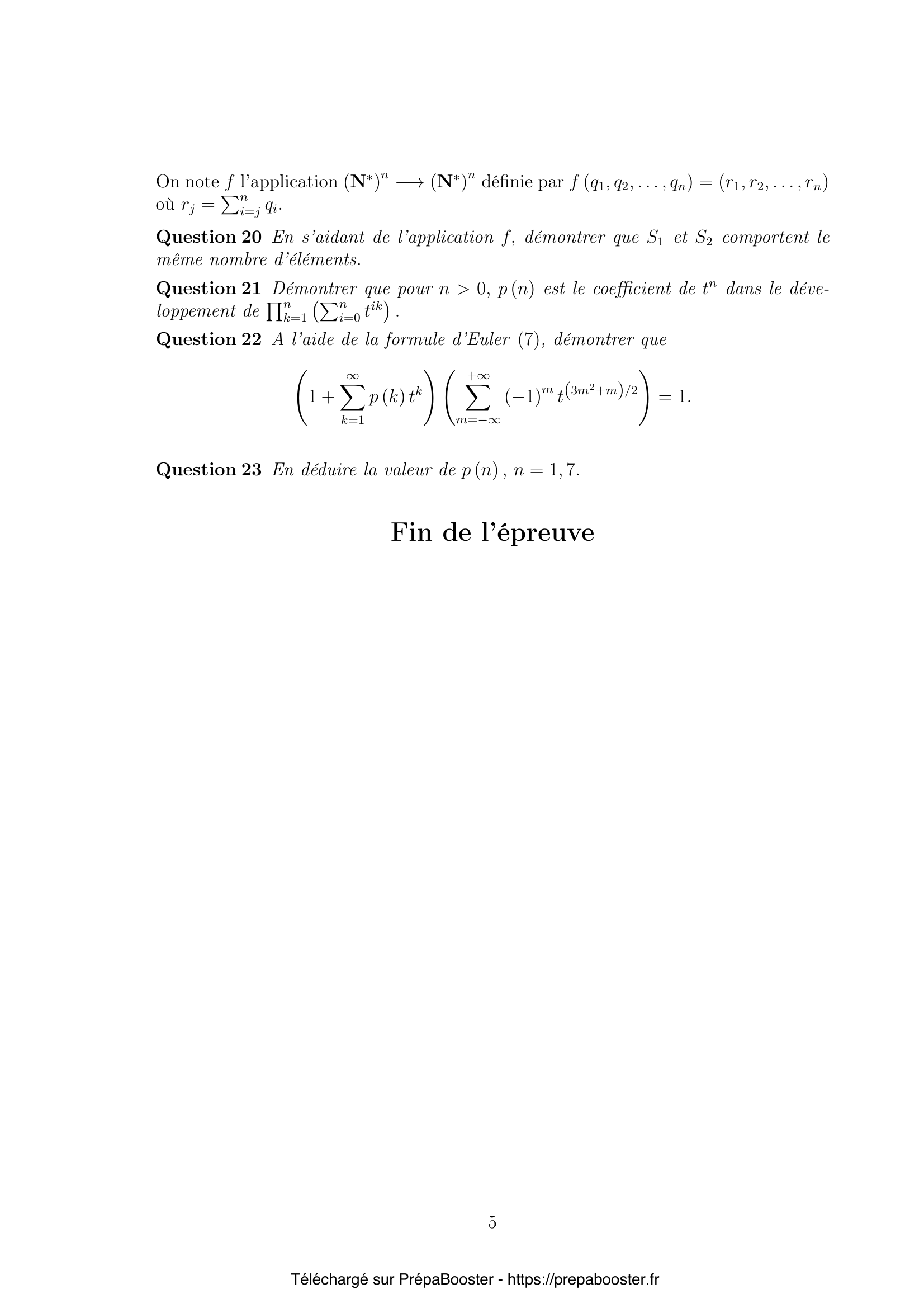 \prod_{m=1}^{\infty}(1 – t^m) = \sum_{m = -\infty}^{+\infty} (-1)^m t^{(3m^2 + m)/2}, \quad t \in \mathbb{R},\; 0 \leq t < 1, \] de celle du triple produit (6). 20. En s’aidant de l’application $f$, démontrer que $S_1$ et $S_2$ comportent le même nombre d’éléments.} 21. Démontrer que pour $n > 0$, $p(n)$ est le coefficient de $t^n$ dans le développement de $\prod_{k=1}^n \prod_{i=0}^n t^{ik}$.