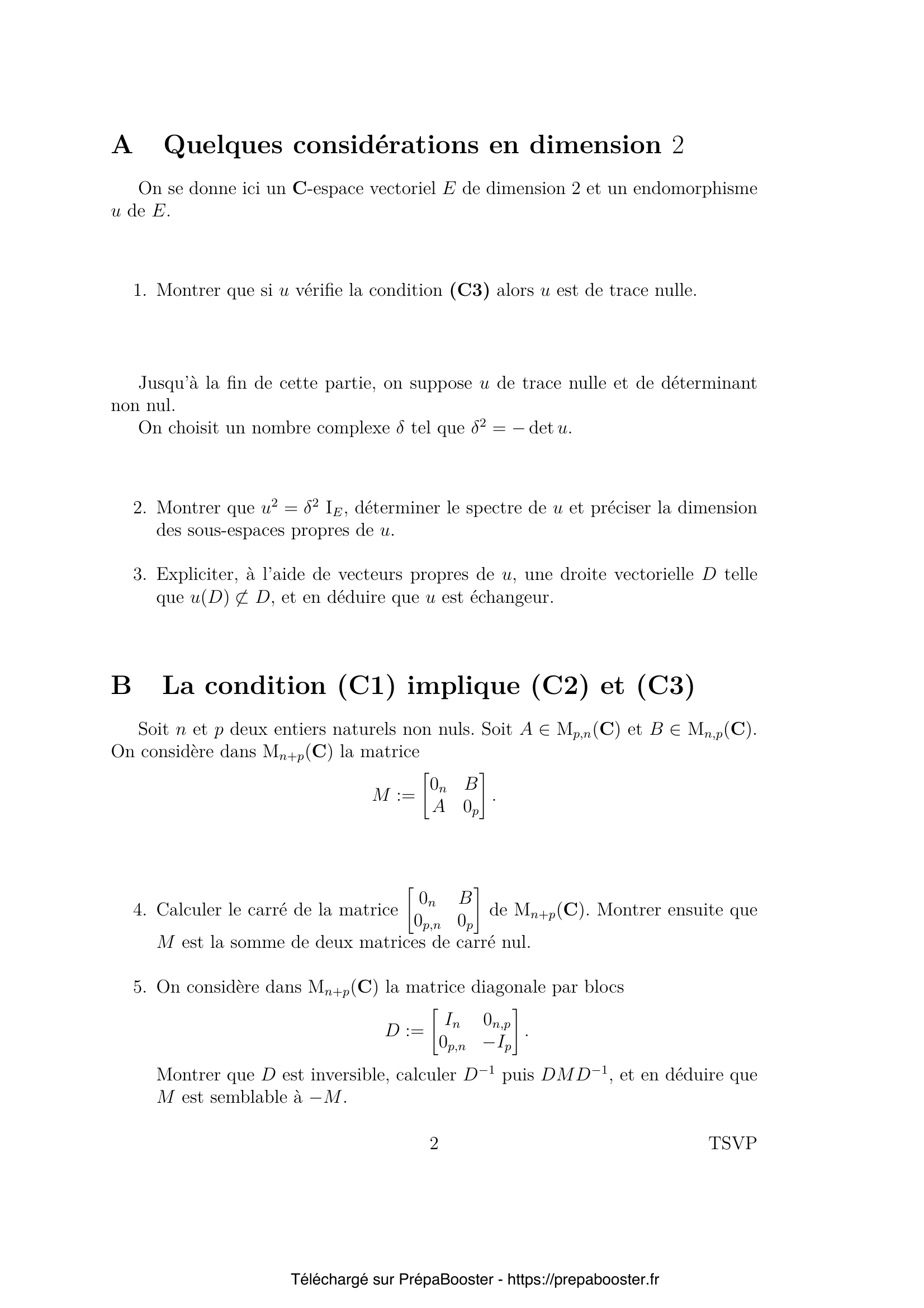 5. On considère dans \mathcal{M}_{n+p}(\mathbb{C}) la matrice diagonale par blocs D := \begin{pmatrix} I_n & 0_{n,p} \\ 0_{p,n} & -I_p \end{pmatrix}. Montrer que D est inversible, calculer D^{-1} puis DMD^{-1}, et en déduire que M est semblable à -M.}