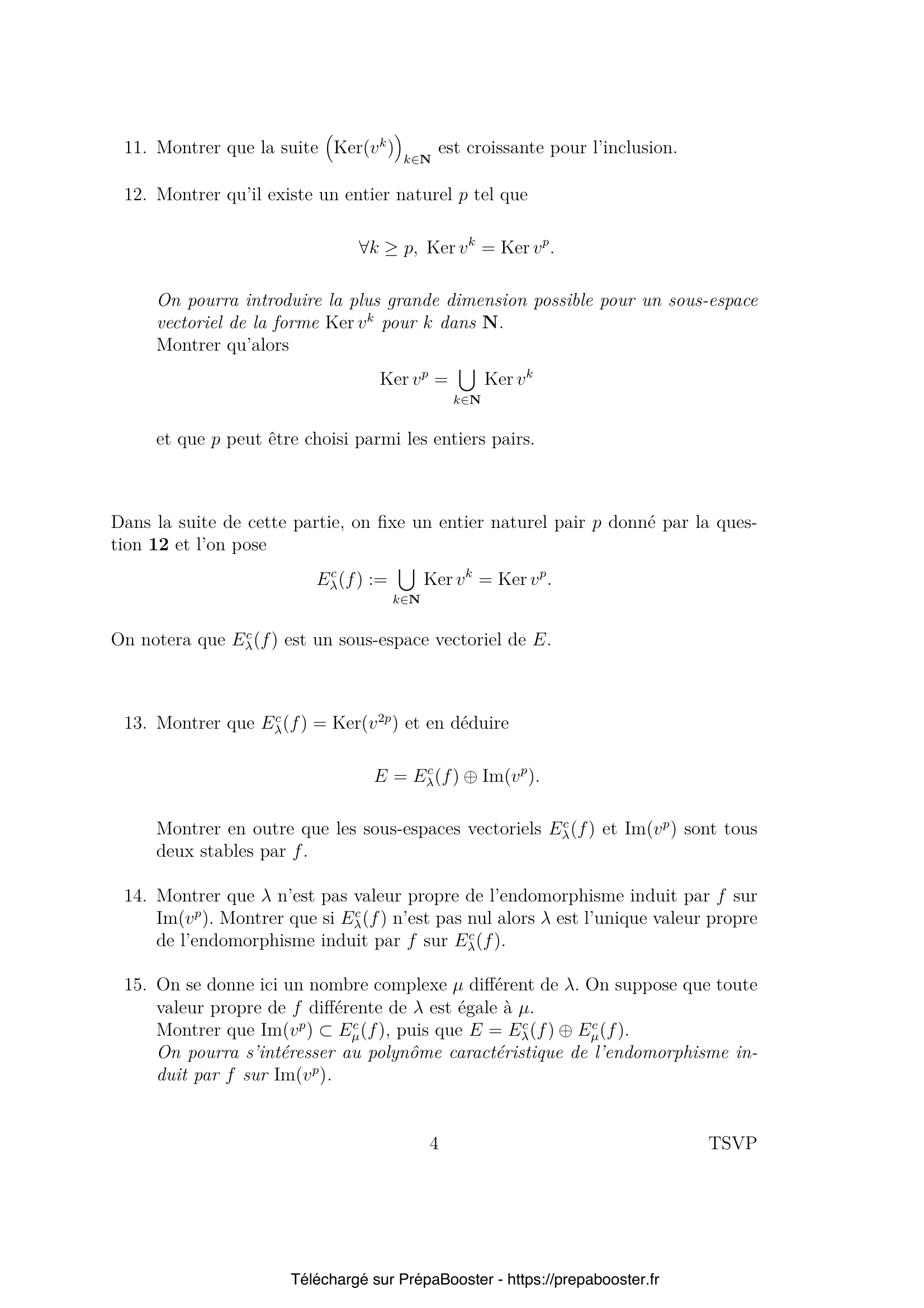 14. Montrer que \lambda n’est pas valeur propre de l’endomorphisme induit par f sur \Im(v^p). Montrer que si E^\mathbb{c}_\lambda(f) n’est pas nul alors \lambda est l’unique valeur propre de l’endomorphisme induit par f sur E^\mathbb{c}_\lambda(f).