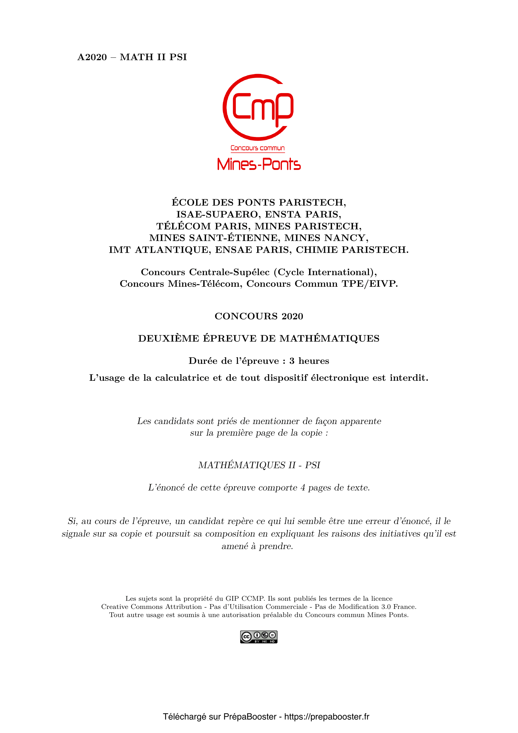 Ce sujet de Mathématiques du concours Mines Ponts PSI 2020 correspond aux épreuves disponibles sur le site officiel du concours Mines Ponts. Retrouve sur Prépa Booster toutes les ressources nécessaires pour ta préparation, y compris les corrigés détaillés.