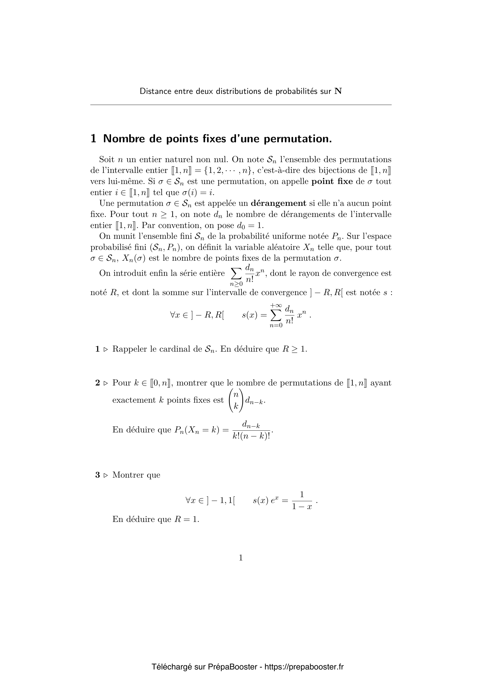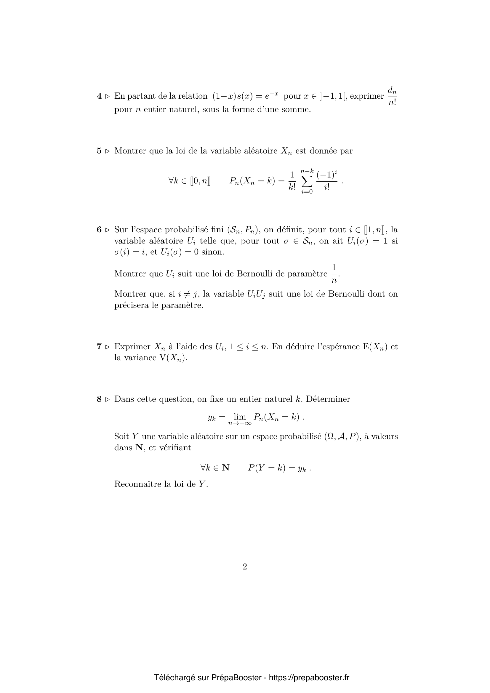 5. Montrer que la loi de la variable aléatoire $X_n$ est donnée par \\ $\forall k \in [[0, n]] ~~~ \mathbb{P}_n(X_n = k) = \dfrac{1}{k!} \sum_{i=0}^{n-k} \dfrac{(-1)^i}{i!}$.}