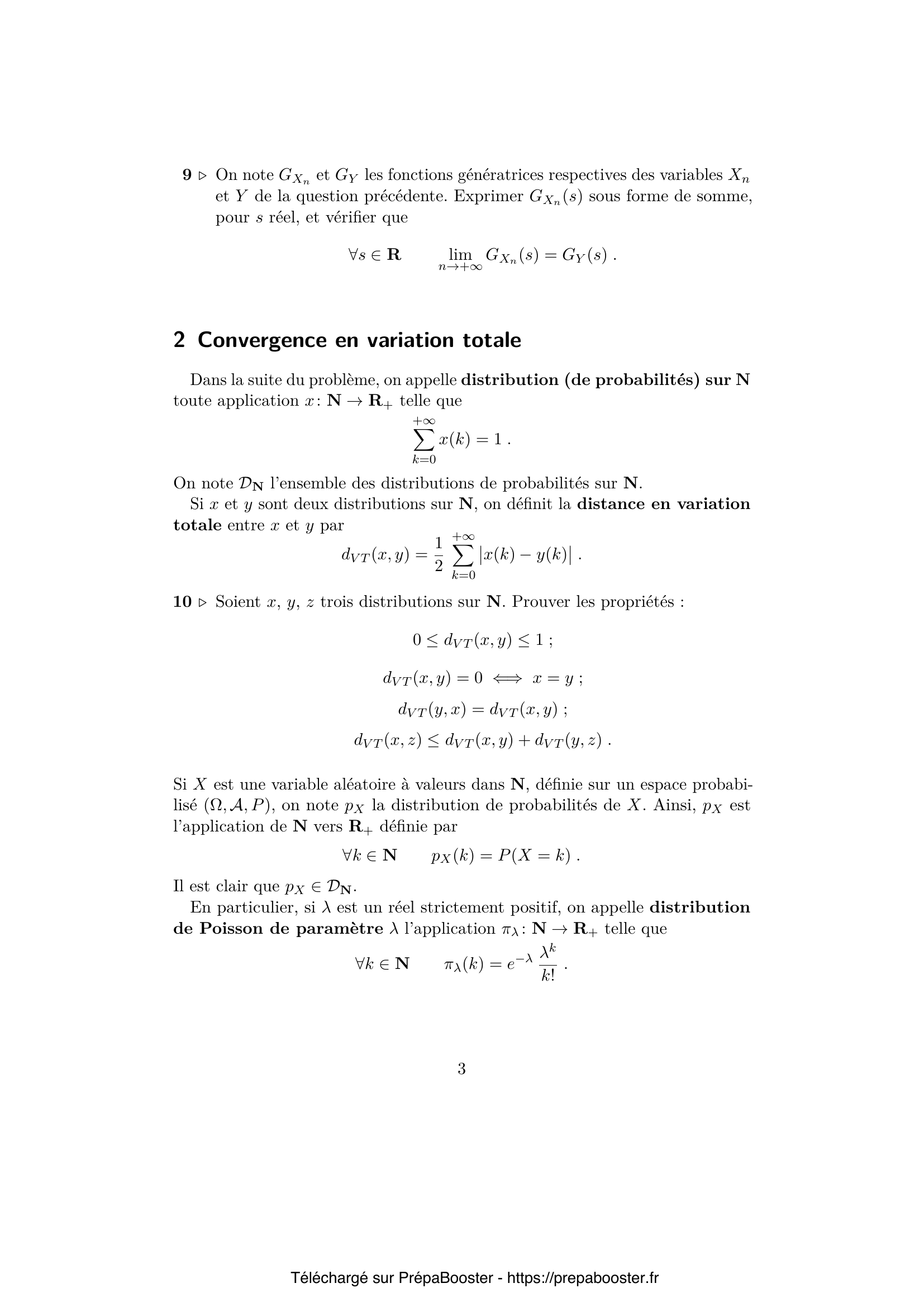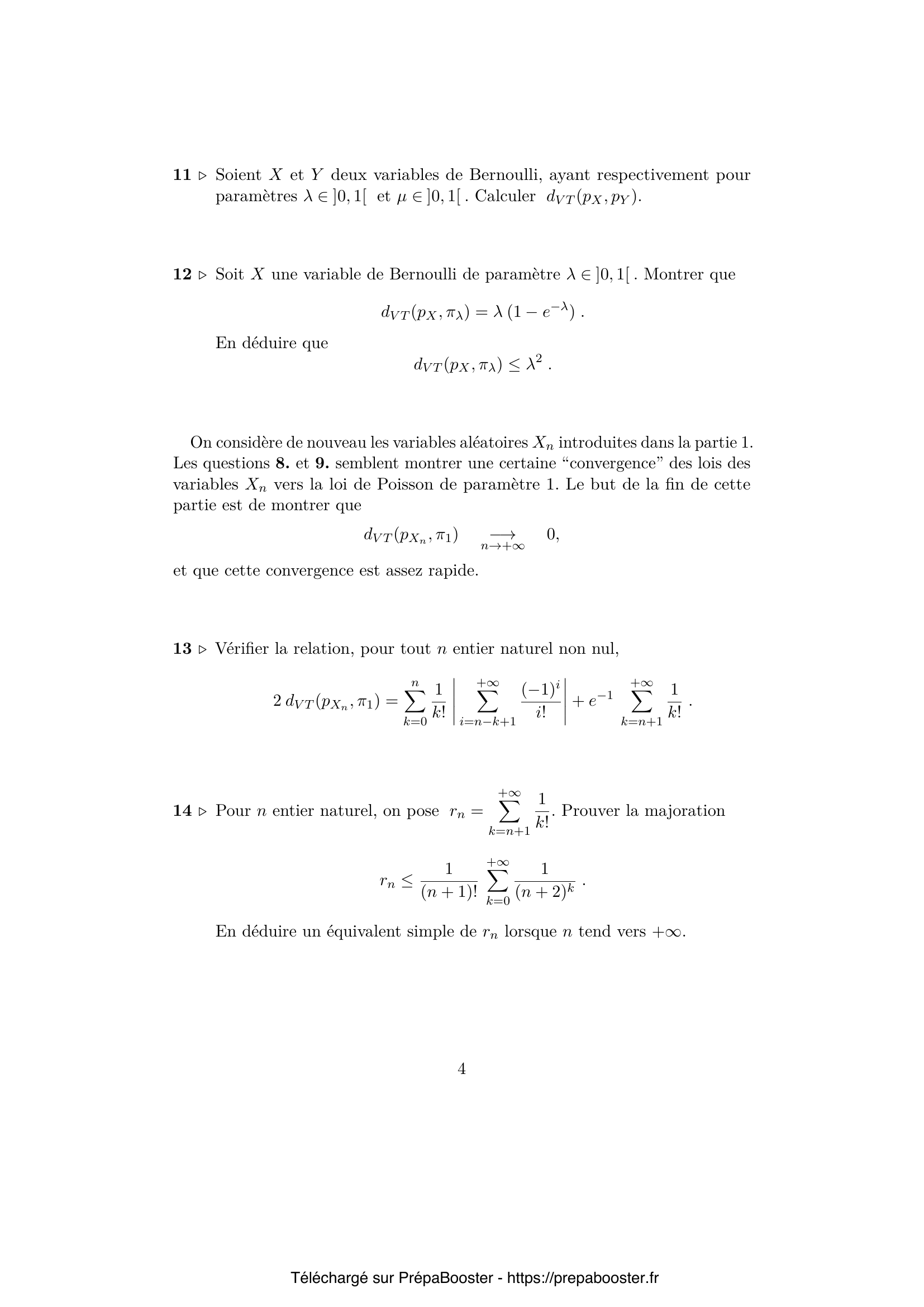 12. Soit $X$ une variable de Bernoulli de paramètre $\lambda \in ]0, 1[$. Montrer que $d_{VT}(p_X, \pi_\lambda) = \lambda (1-e^{-\lambda})$. \\ En déduire que $d_{VT}(p_X, \pi_\lambda) \leq \dfrac{\lambda^2}{2}$.