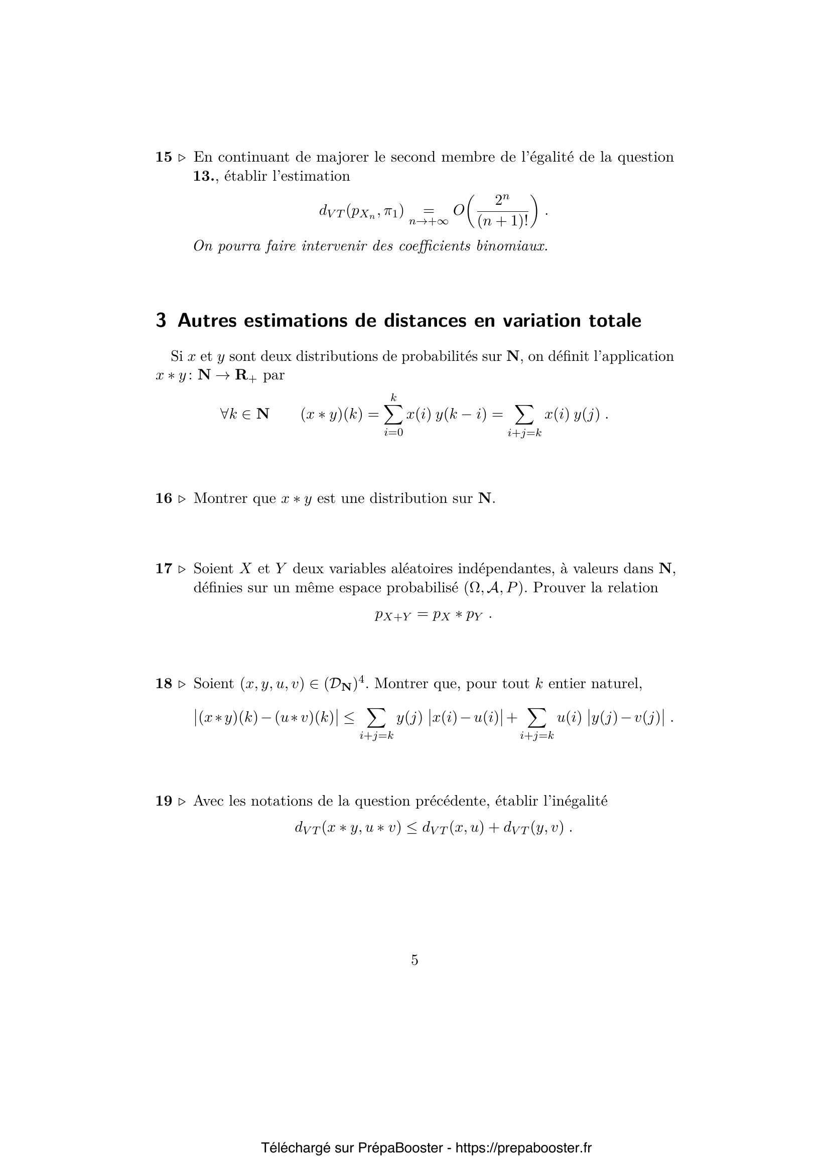 15. En continuant de majorer le second membre de l’égalité de la question 13., établir l’estimation \\ $d_{VT}(p_{X_n}, \pi_1) = O\left(\dfrac{2n}{(n+1)!}\right)$ lorsque $n \to +\infty$. \\ On pourra faire intervenir des coefficients binomiaux.}