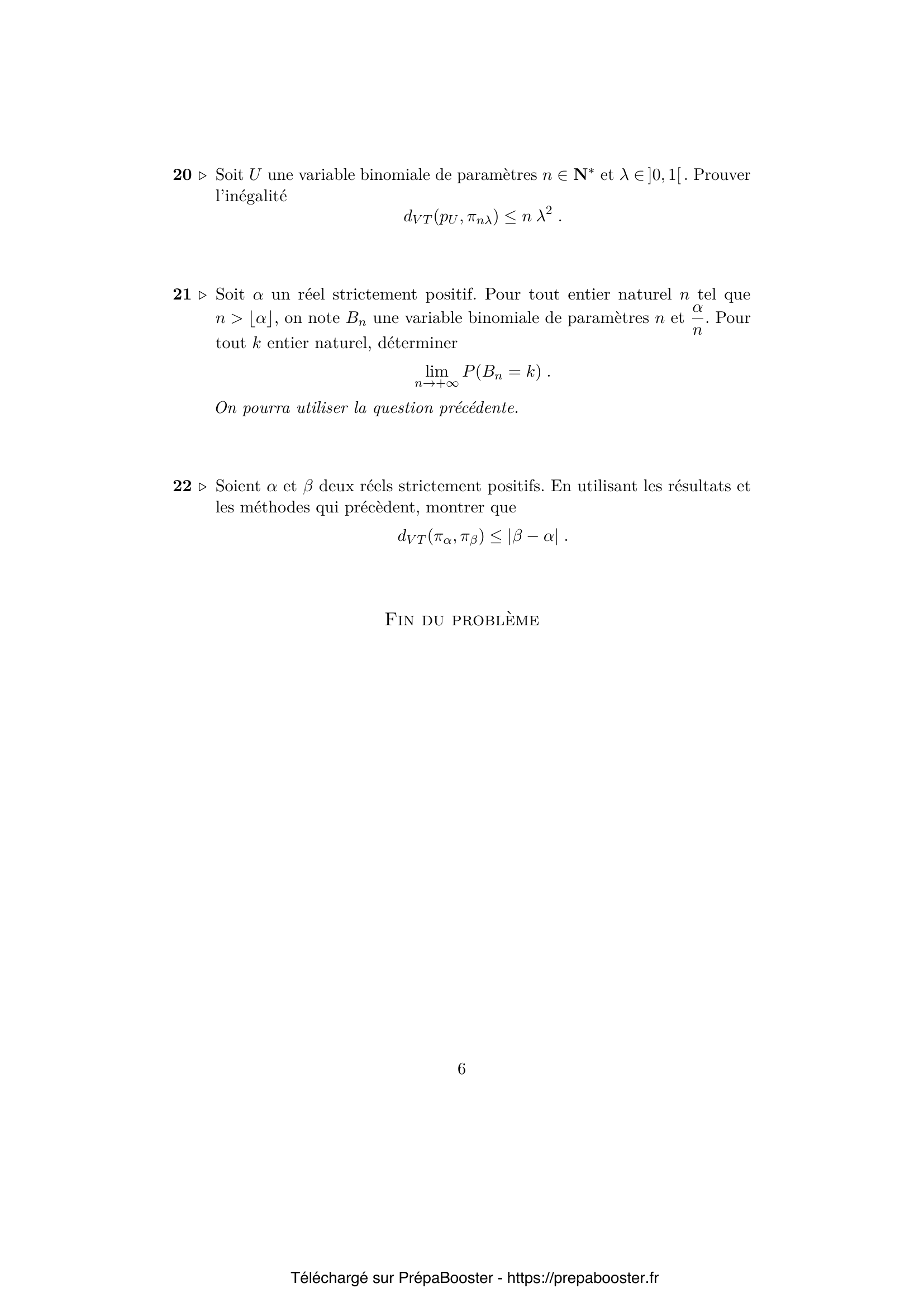 21. Soit $\alpha$ un réel strictement positif. Pour tout entier naturel $n$ tel que $n > \lfloor \alpha \rfloor$, on note $B_n$ une variable binomiale de paramètres $n$ et $\frac{\alpha}{n}$. Pour tout $k$ entier naturel, déterminer \\ $\lim_{n\to+\infty} \mathbb{P}(B_n = k)$. \\ On pourra utiliser la question précédente.