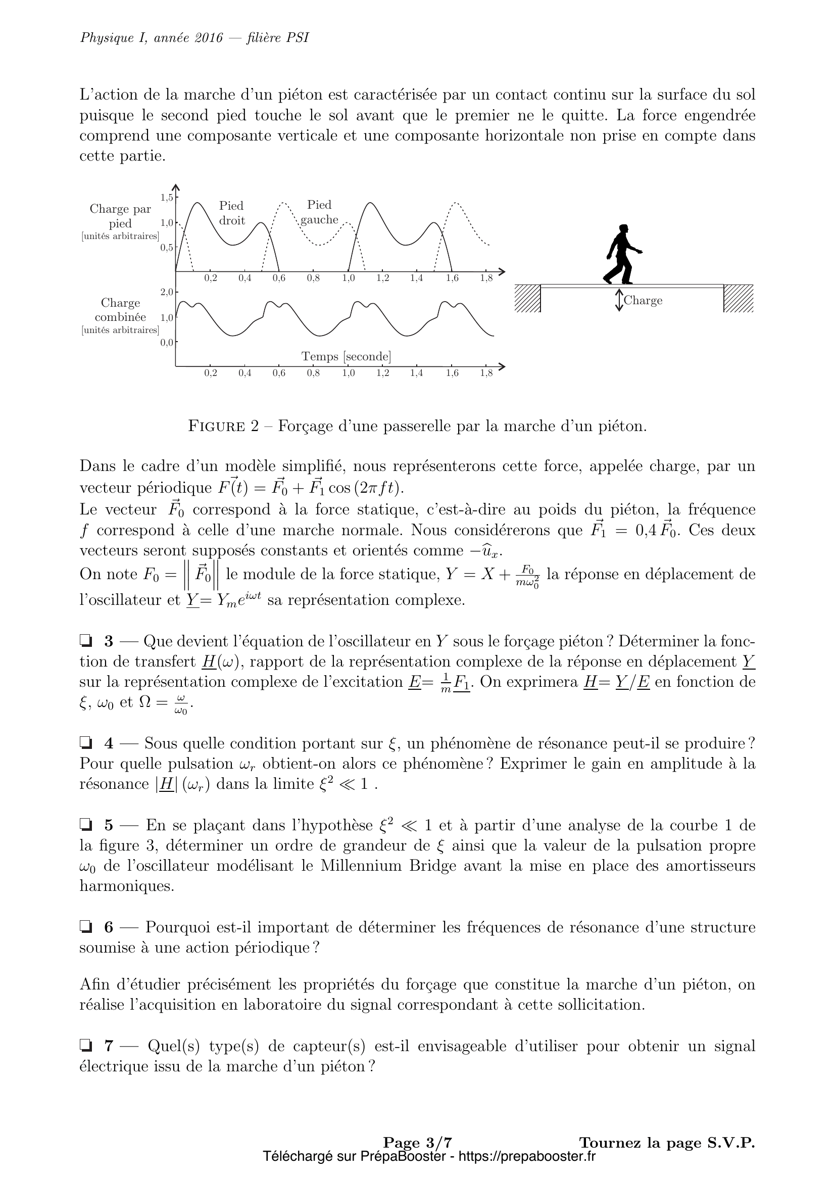 5. En se pla\c{c}ant dans l’hypoth\`ese $\xi^2 \ll 1$ et \`a partir d’une analyse de la courbe 1 de la figure 3, d\’eterminer un ordre de grandeur de $\xi$ ainsi que la valeur de la pulsation propre $\omega_0$ de l’oscillateur mod\’elisant le Millennium Bridge avant la mise en place des amortisseurs harmoniques.}