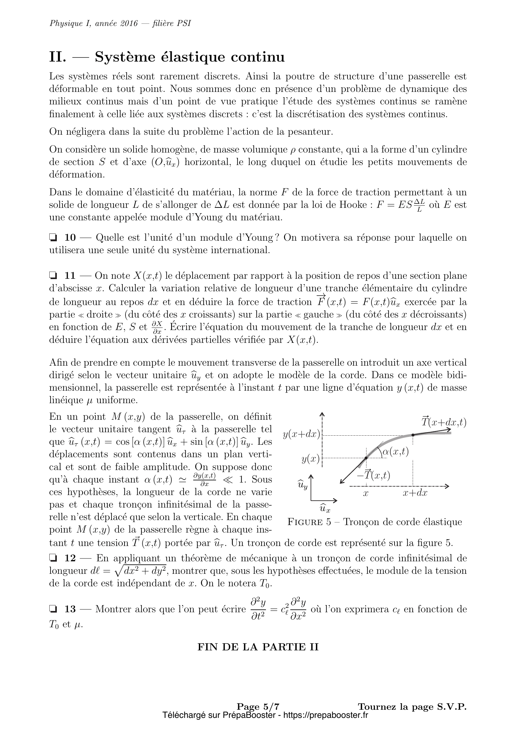 13. Montrer alors que l’on peut \’ecrire $\frac{\partial^2 y}{\partial t^2} = c_\ell^2 \frac{\partial^2 y}{\partial x^2}$ o\`u l’on exprimera $c_\ell$ en fonction de $T_0$ et $\mu$.