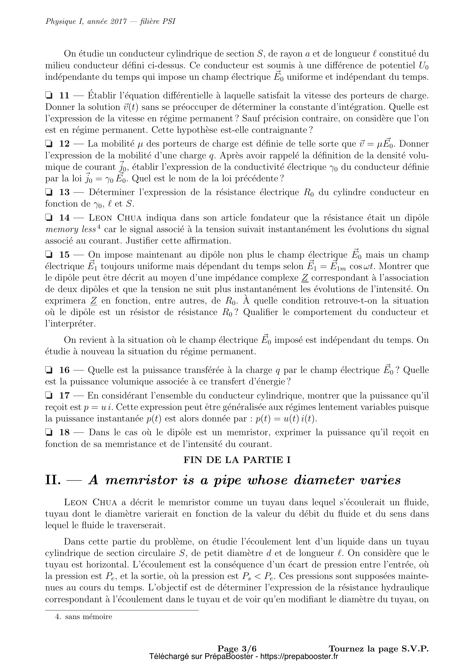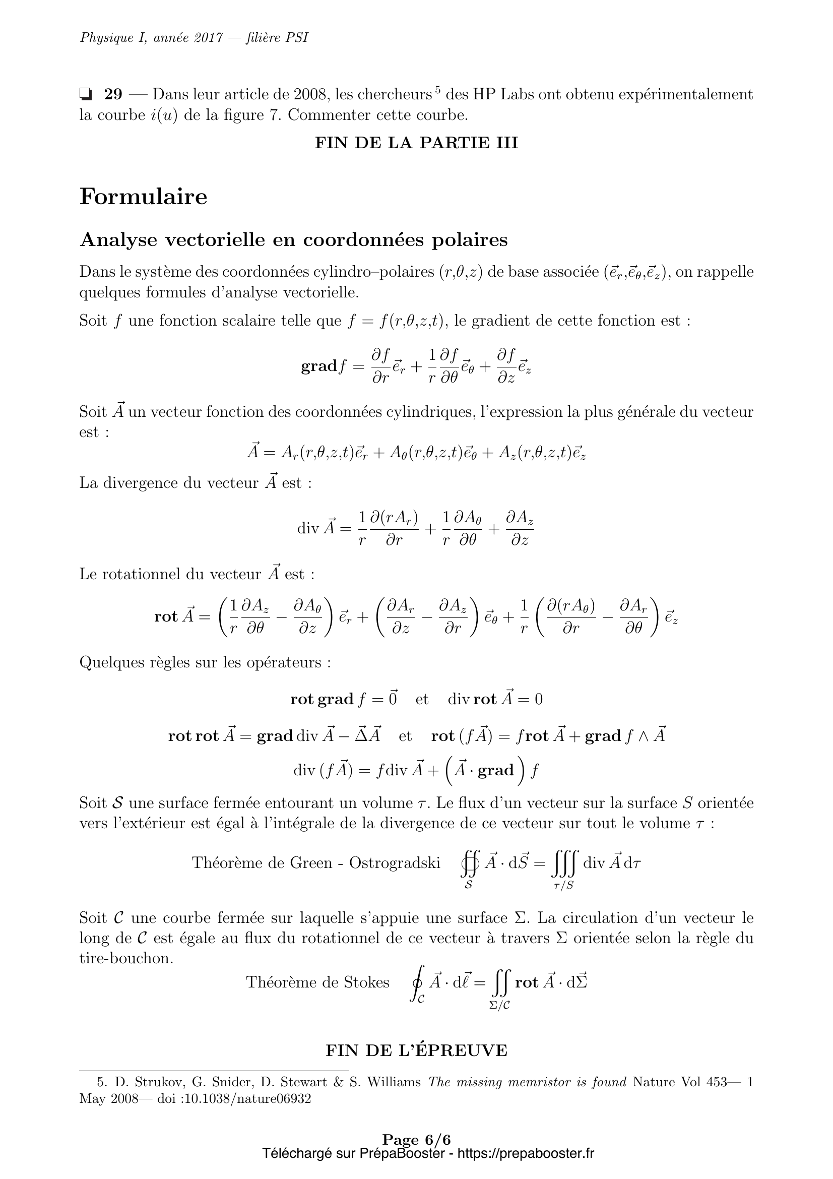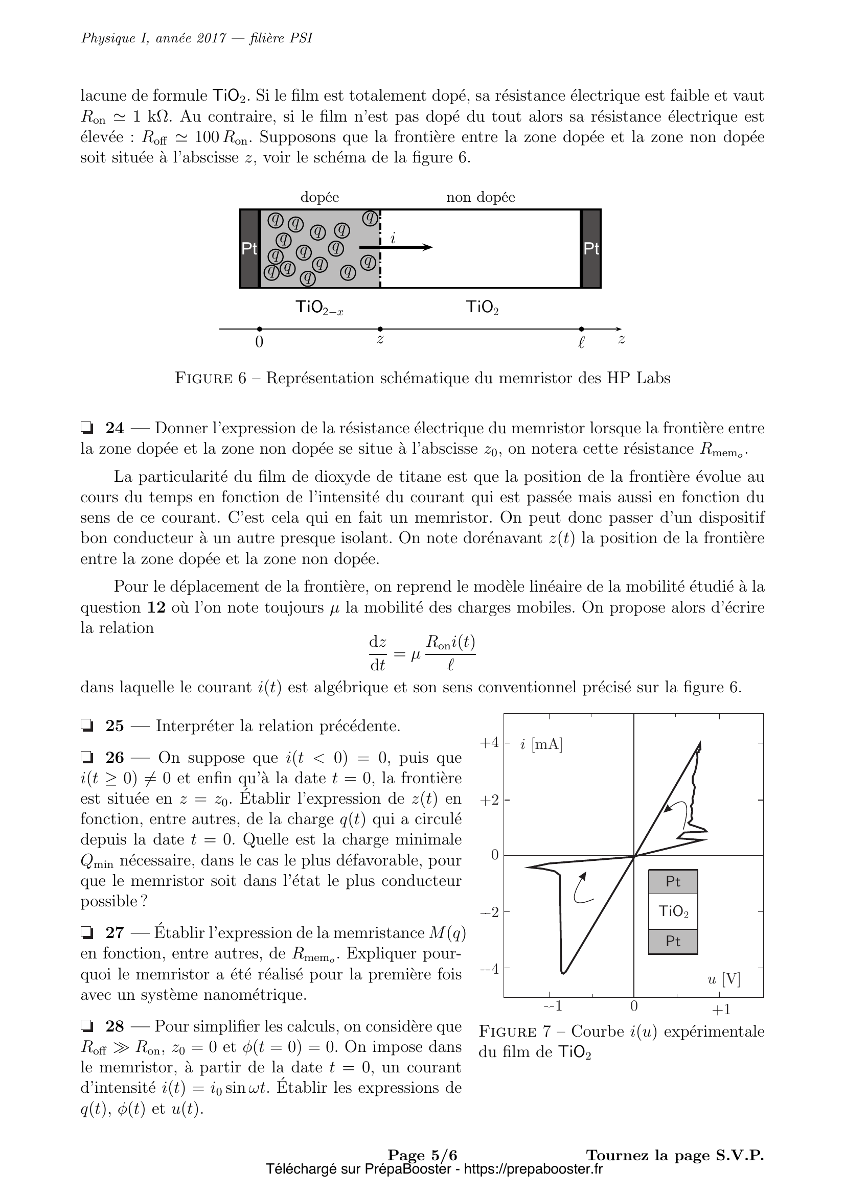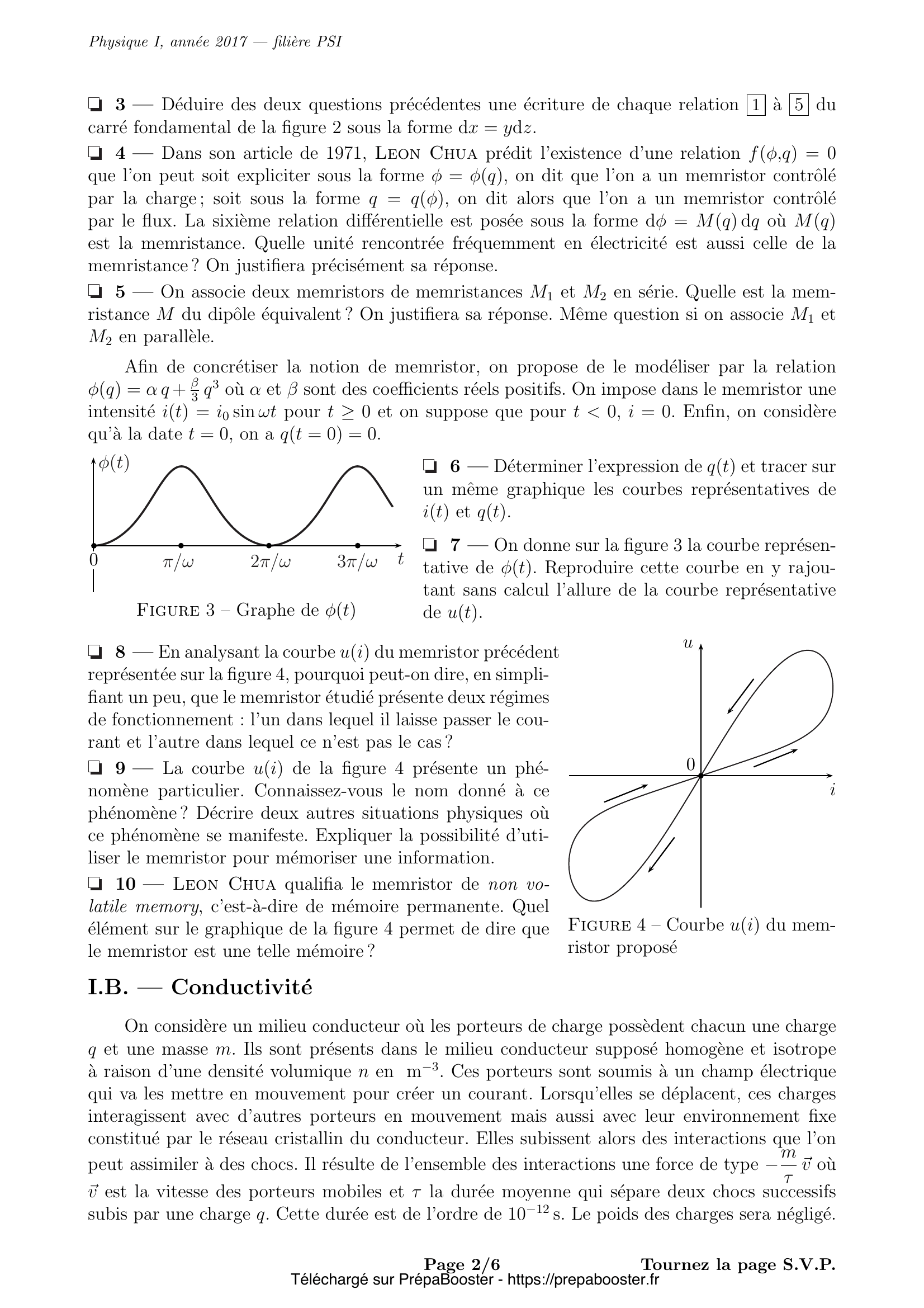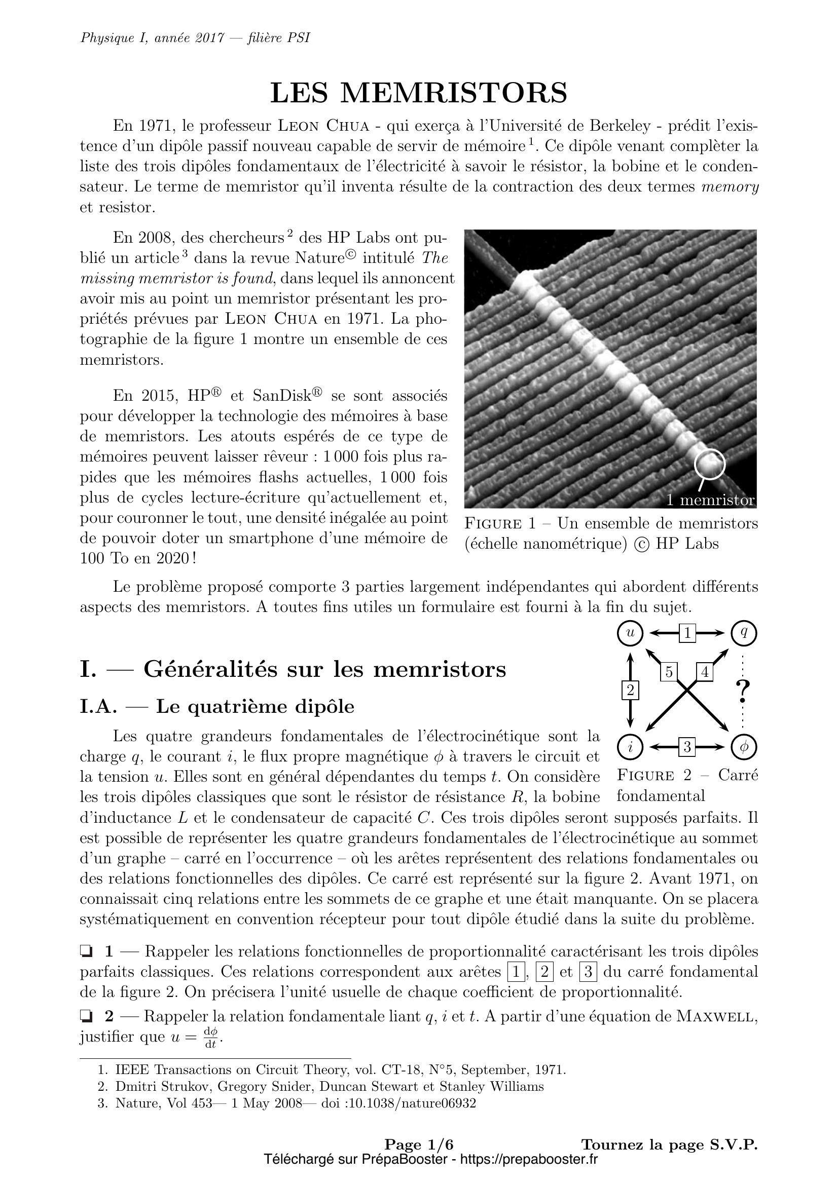 4. Dans son article de 1971, Leon Chua pr\’edit l’existence d’une relation $f(\varphi, q)=0$ que l’on peut soit expliciter sous la forme $\varphi = \varphi(q)$, on dit que l’on a un memristor contr\^ol\’e par la charge ; soit sous la forme $q = q(\varphi)$, on dit alors que l’on a un memristor contr\^ol\’e par le flux. La sixi\`eme relation diff\’erentielle est pos\’ee sous la forme $d\varphi = M(q)\, dq$ o\`u $M(q)$ est la memristance. Quelle unit\’e rencontr\’ee fr\’equemment en \’electricit\’e est aussi celle de la memristance ? On justifiera pr\’ecis\’ement sa r\’eponse.