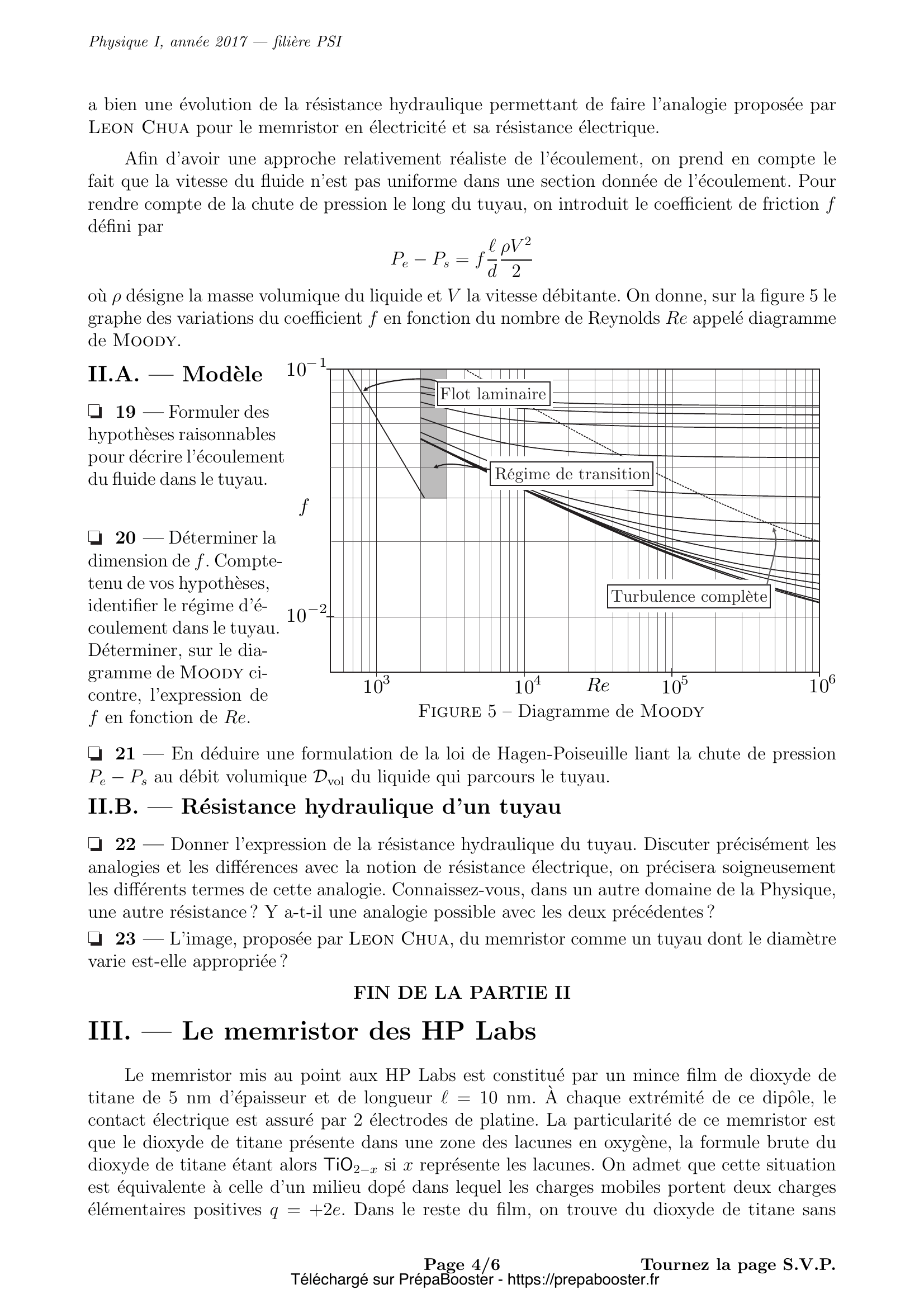 20. D\’eterminer la dimension de $f$. Compte-tenu de vos hypoth\`eses, identifier le r\’egime d’\’ecoulement dans le tuyau. D\’eterminer, sur le diagramme de Moody ci-contre, l’expression de $f$ en fonction de $Re$.}