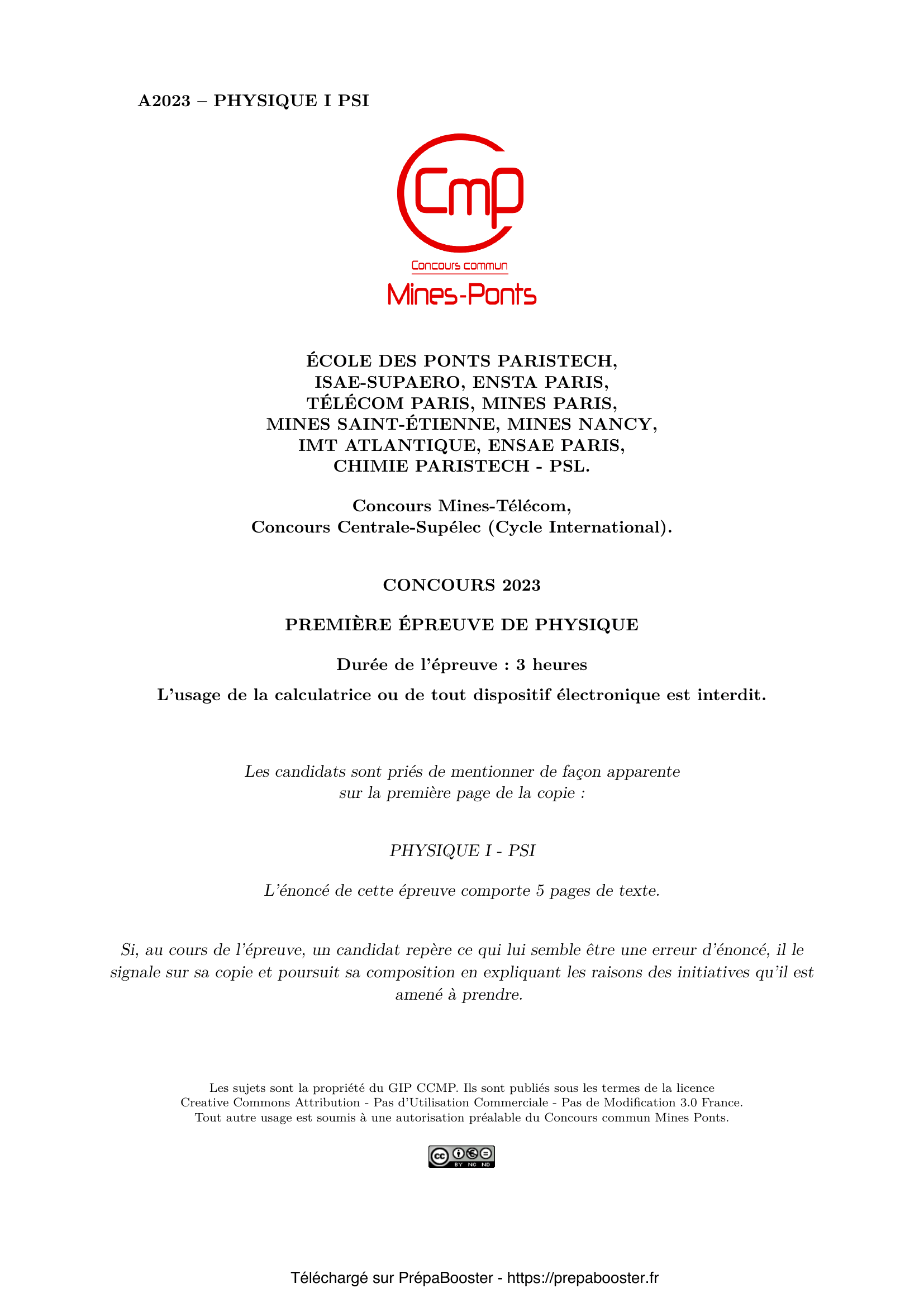 Ce sujet de Physique du concours Mines Ponts PSI 2023 correspond aux épreuves disponibles sur le site officiel du concours Mines Ponts. Retrouve sur Prépa Booster toutes les ressources nécessaires pour ta préparation, y compris les corrigés détaillés.
