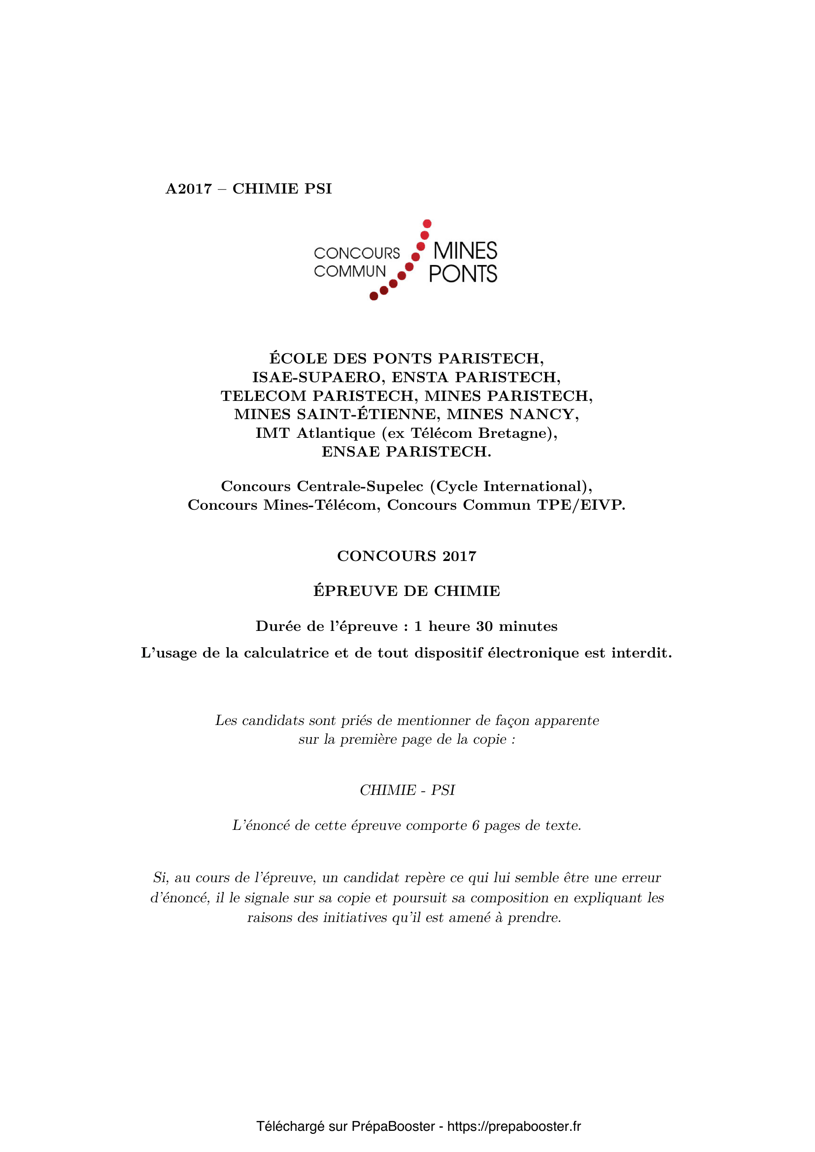Ce sujet de Chimie du concours Mines Ponts PSI 2017 correspond aux épreuves disponibles sur le site officiel du concours Mines Ponts. Retrouve sur Prépa Booster toutes les ressources nécessaires pour ta préparation, y compris les corrigés détaillés.