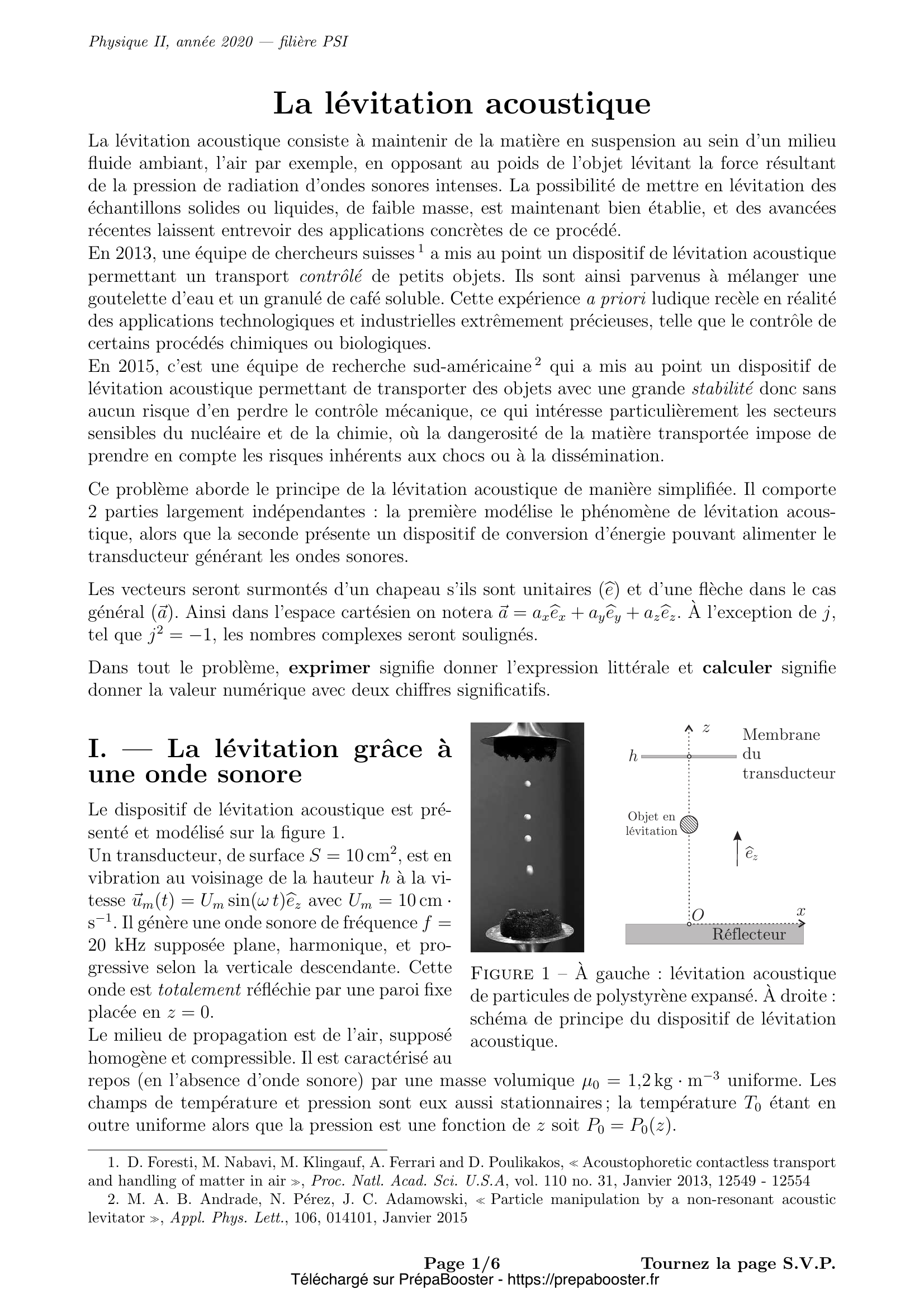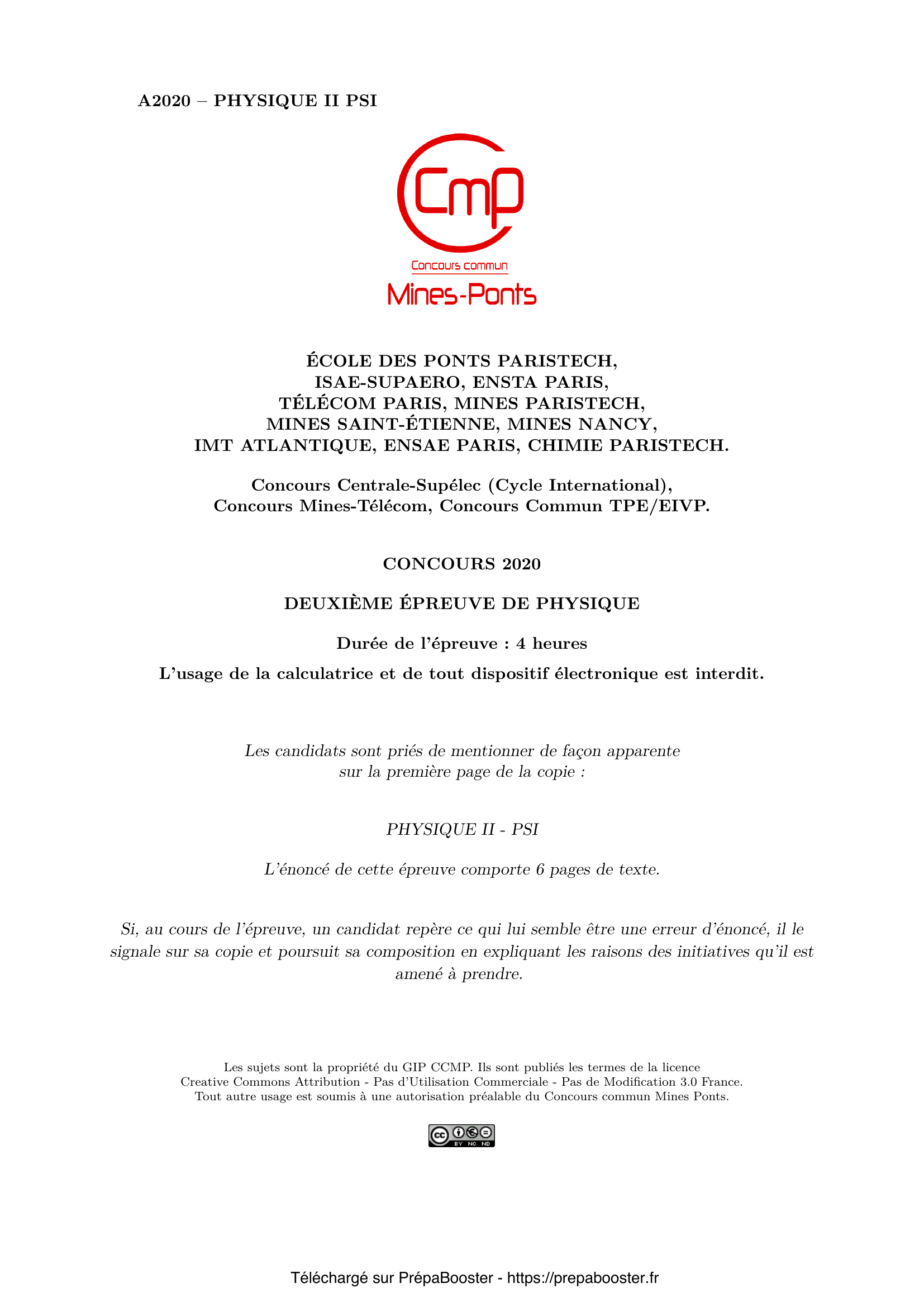 Ce sujet de Physique du concours Mines Ponts PSI 2020 correspond aux épreuves disponibles sur le site officiel du concours Mines Ponts. Retrouve sur Prépa Booster toutes les ressources nécessaires pour ta préparation, y compris les corrigés détaillés.