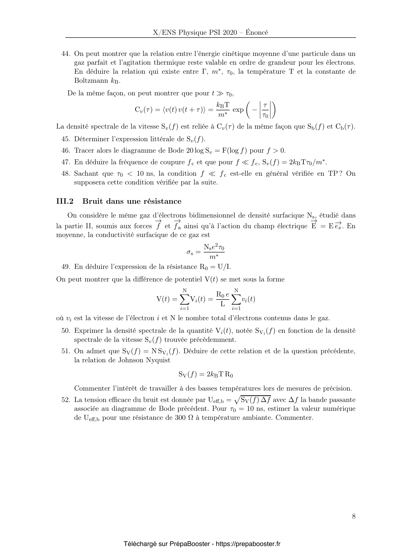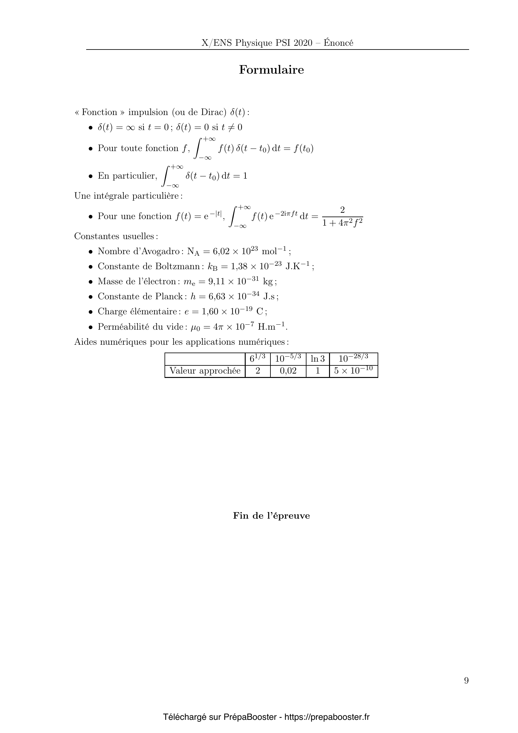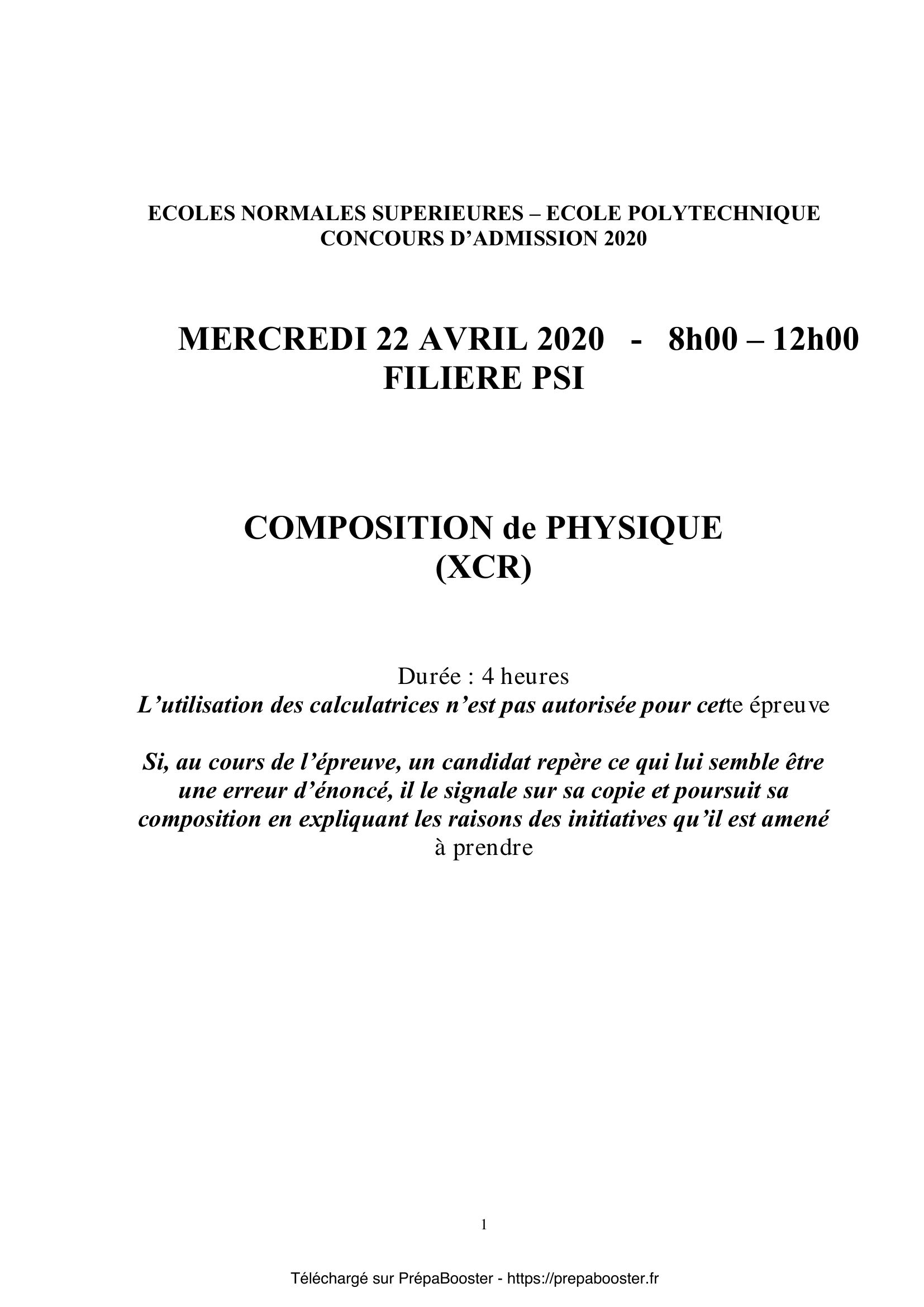 Ce sujet de Physique du concours XENS PSI 2020 correspond aux épreuves disponibles sur le site officiel du concours XENS. Retrouve sur Prépa Booster toutes les ressources nécessaires pour ta préparation, y compris les corrigés détaillés.